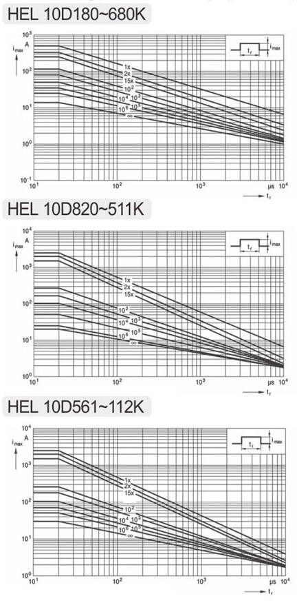 14D滿足20D的 脈沖性能要求 14D instead of 20D 舉例2 Example HEL14D561KX能達到 6KV/3KA 100次 HEL14D561KX reach 6KV/3KA 100 times? |